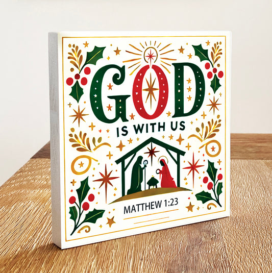 God is with us Matt. 1:23 - Decorative Wooden Block With Bible Verses - Faith-Inspired Home Decor
