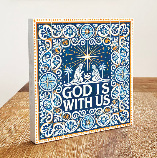 God is with us (Matt. 1:23) - Azulejos Inspired Wooden Block With Bible Verse - Christmas Home Decor