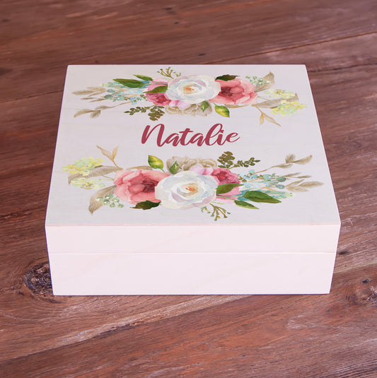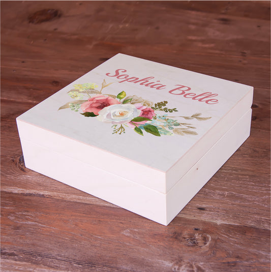 Wooden Memory Box for Baby Girl - Personalized Baby Name Gift - Floral Wreath Themed