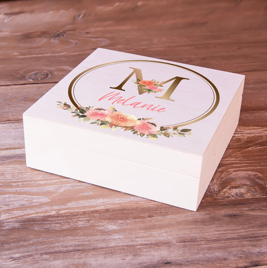 Custom Monogram Wooden Memory Box for Baby Girl - Floral Wreath Themed
