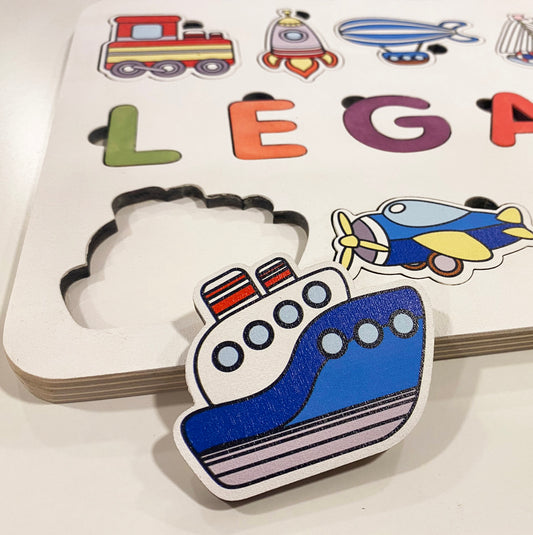 Custom Name Puzzle with Cars, Planes, Automobiles and Space Ship - First Birthday Gift for Boy or Girl